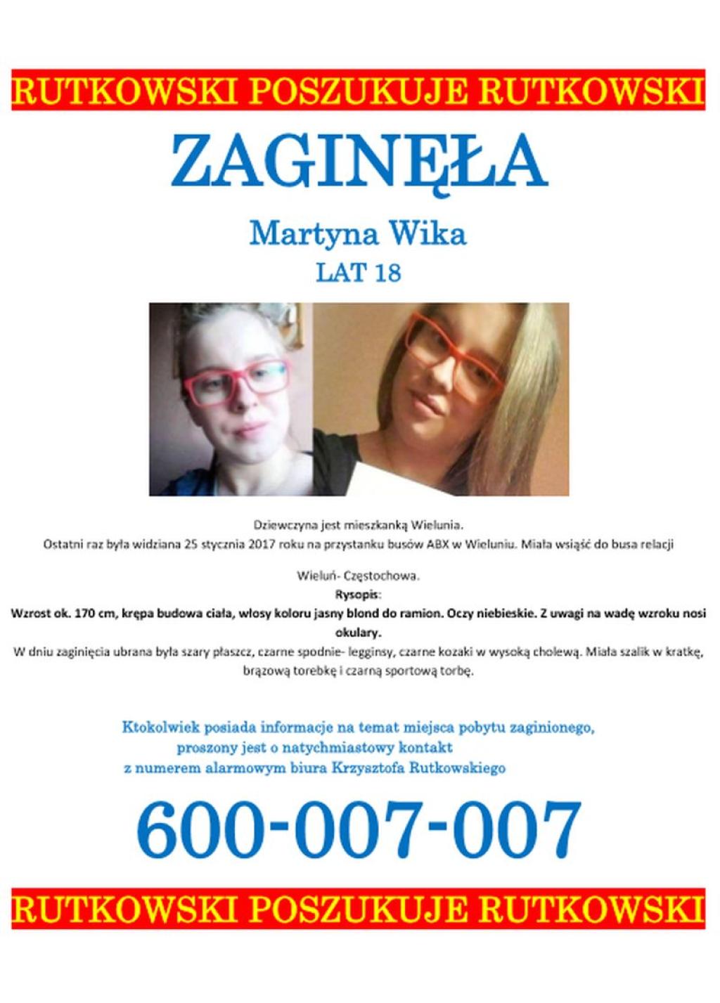 Rutkowski ruszył na poszukiwania 18- letniej Martyny Wika. Dziewczyna z Wielunia zniknęła 25 stycznia