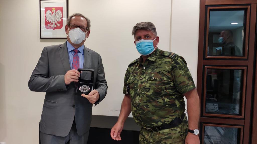Podczas spotkania ambasador Krzysztof Olendzki w imieniu Prezydenta RP Andrzeja Dudy wręczył srebrny medal „Za Długoletnią Służbę” st.chor.szt.SG Grzegorzowi Kucie.