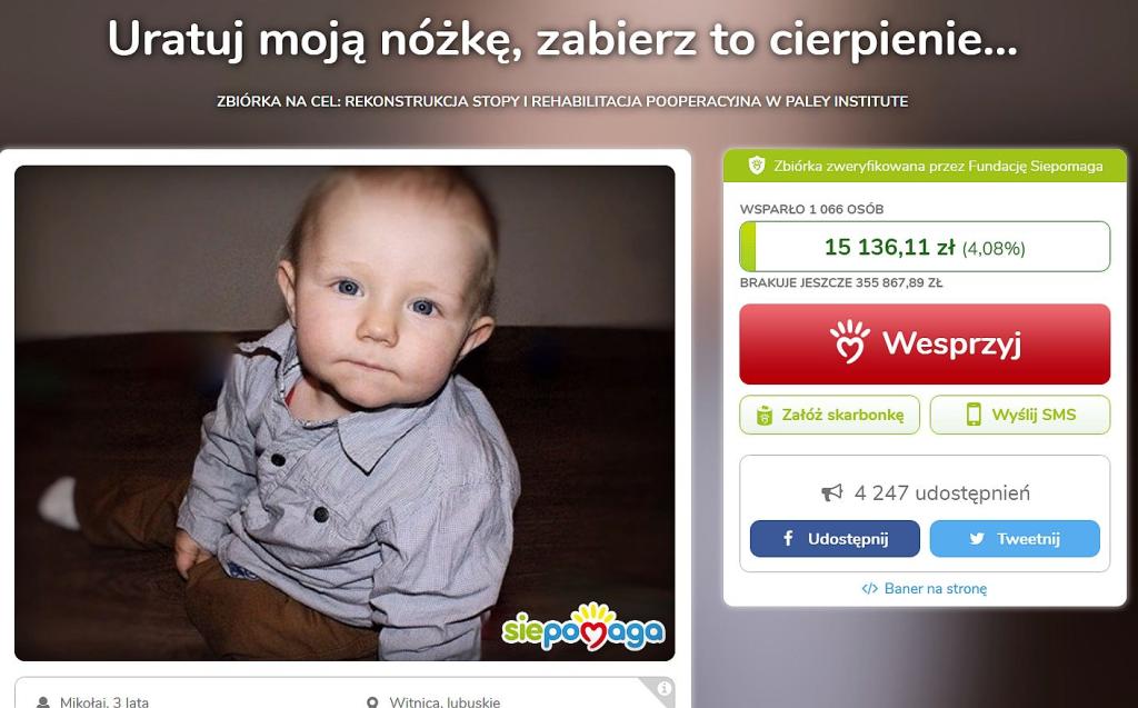 Zbiórkę na rzecz kosztownej rehabilitacji chłopca prowadzi Fundacja Sie Pomaga.