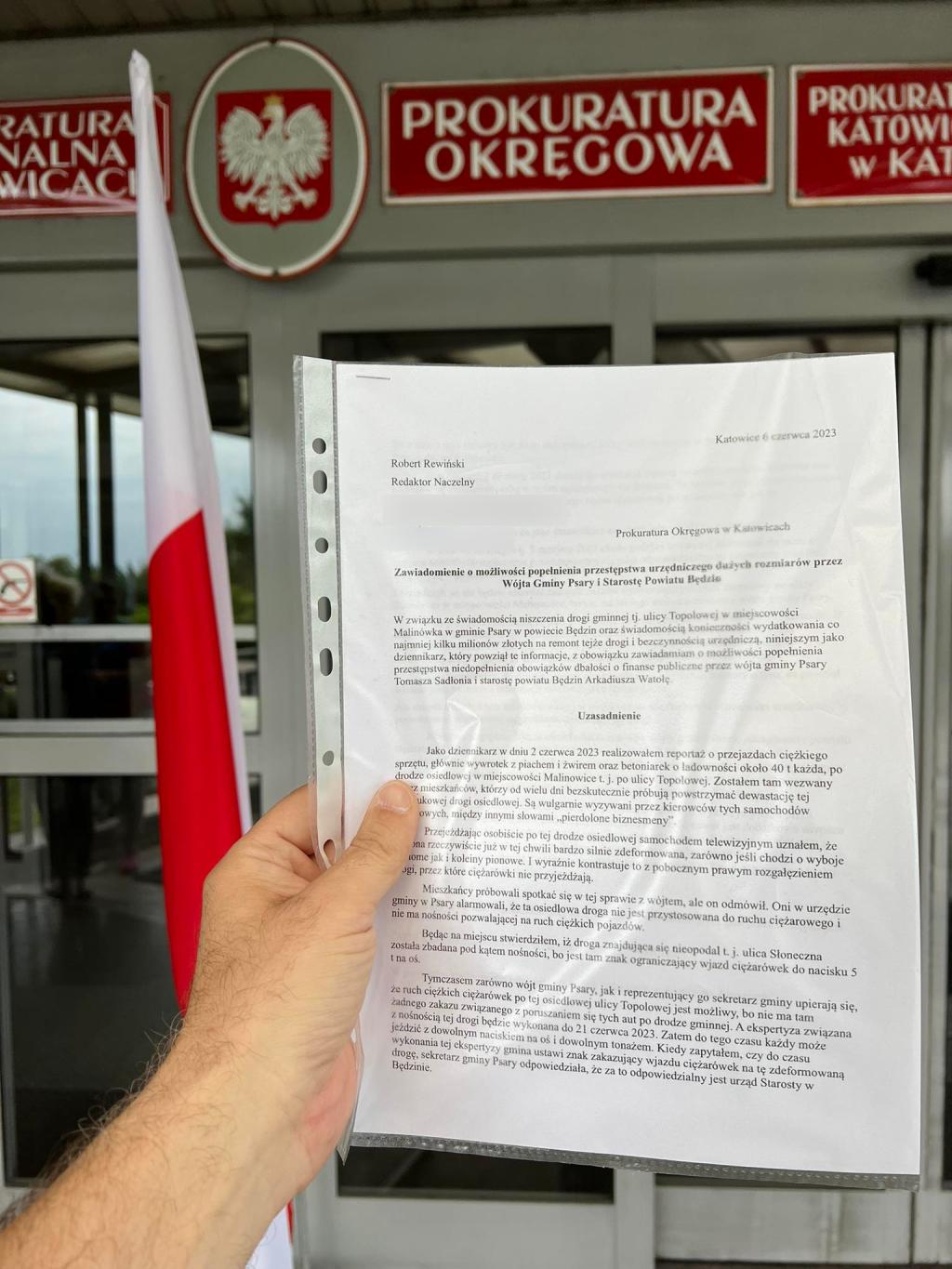 W związku ze świadomością niszczenia drogi gminnej tj. ulicy Topolowej w miejscowości Malinowice w gminie Psary w powiecie Będzin oraz świadomością konieczności wydatkowania co najmniej kilku milionów złotych na remont tejże drogi i bezczynnością urzędniczą, niniejszym jako dziennikarz który powziął te informacje z obowiązku zawiadamiam o możliwości popełnienia przestępstwa niedopełnienia obowiązków dbałości o finanse publiczne przez wójta gminy Psary Tomasza Sadłonia i starostę powiatu Będzin Arkadiusza Watołę