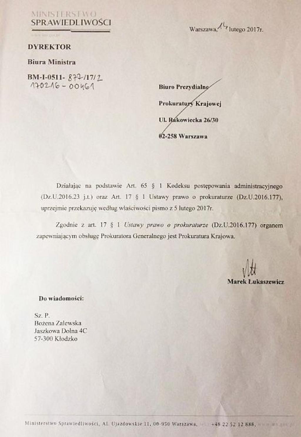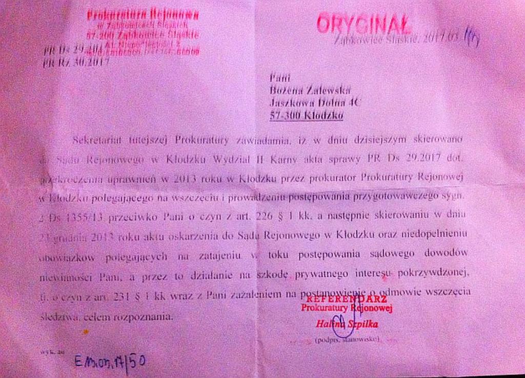 Zrobiła to kiedy jej wniosek o ukaranie prokurator Sałackiej został przez tutejszą prokuraturę umorzony. Bożena Zalewska zaskarżyła tę decyzję i teraz będzie tę skargę rozpatrywał sąd w... Kłodzku!