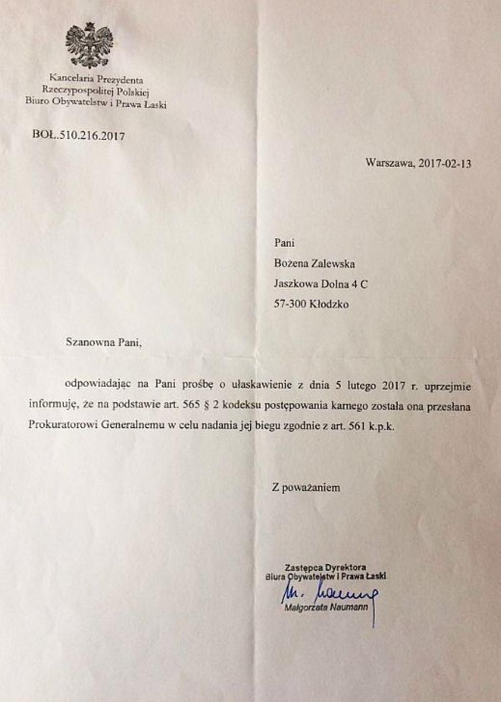 Bozena Zalewska upatruje nadziei już tylko w Prezydencie Rzeczypospolitej. Zwróciła się do Andrzeja Dudy o ułaskawienie jej od tego niesprawiedliwego dla niej wyroku.