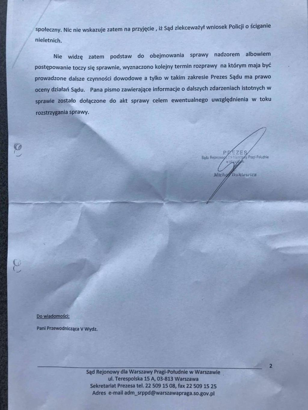 Prezes Sądu Michał Bukiewicz odmówił rodzicom objęcia sprawy swoim nadzorem.