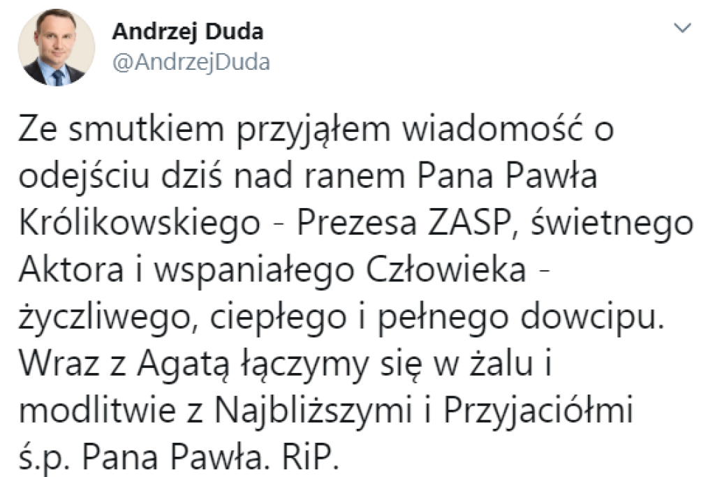 „Ze smutkiem przyjąłem wiadomość o odejściu dziś nad ranem Pana Pawła Królikowskiego – Prezesa ZASP, świetnego Aktora i wspaniałego Człowieka – życzliwego, ciepłego i pełnego dowcipu. Wraz z Agatą łączymy się w żalu i modlitwie z Najbliższymi i Przyjaciółmi ś.p. Pana Pawła. RiP” – napisał Prezydent Andrzej Duda w jednym z serwisów społecznościowych.