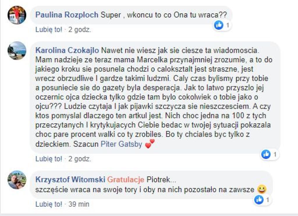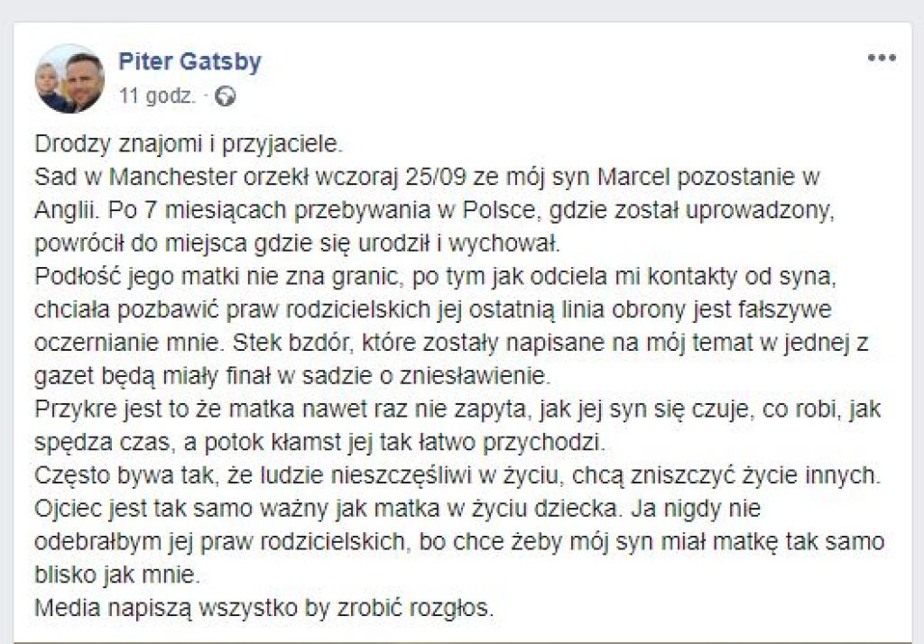 At the time, they requested contact with Marcel until a decision was issued on October 4, 2019 resulting from the Hague Convention, which he had submitted in Great Britain for consideration by Piotr Mitręga District Court in Szczecin. He argued that he was so poor, homesick and would like to spend time by himself with his son in Poland.