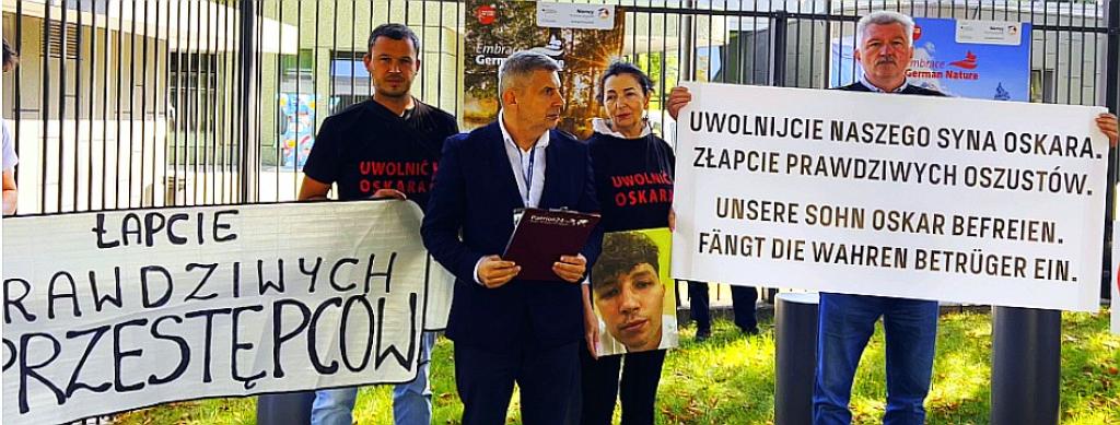 Rodzice uwięzionego we Freiburgu polskiego studenta wzięli udział w proteście przeciwko metodom działania niemieckiej policji i prokuratury. Razem z innymi poszkodowanymi domagali się ścigania rzeczywistych przestępców, a nie okazjonalnych pracowników!