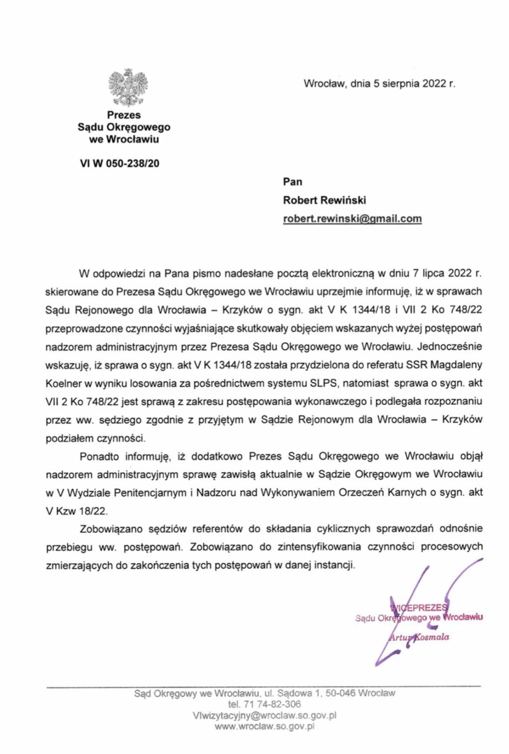 Przełom nastąpił 5 sierpnia 2022, kiedy po naszej interwencji Prezes Sądu Okręgowego we Wrocławiu zdecydował się objąć nadzór nad zaniechaniami podległych mu sędziów i uporządkować wszelkie sprawy toczące się w jego okręgu względem Tomasza K. (przypomnijmy, że miał on pierwotnie na nazwisko M., ale skazany za liczne oszustwa postarał się o zmianę tożsamości).