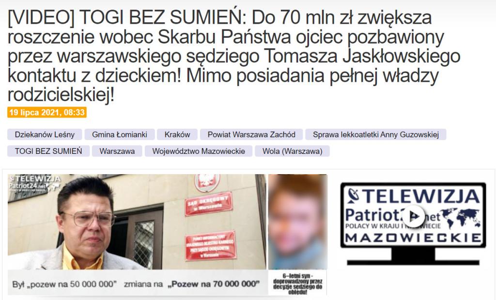 - Ten dzielny ojciec złożył pozew o 50 000 000 zł za pozbawienie go kontaktu z dzieckiem. Kiedy podwyższą stawkę do 70 000 000 Sąd Okręgowy w Warszawie w sposób bałaganiarski uznał za oczywiście bezzasadny. Dziś jednak okazuje się że to paranoiczne decyzję sędziego Tomasza Jaskłowskiego są bezzasadne. I powinien on się honorowo zrzec prowadzenia tej sprawy przekazując ją komuś lepszemu i bardziej kompetentnemu - komentuje Robert Rewiński, Redaktor Naczelny Patriot24.net i Telewizja.Patriot24.net