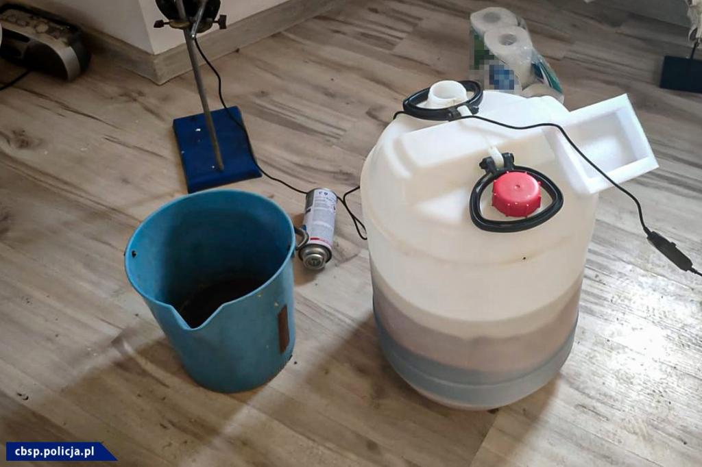 Niemal w całym mieszkaniu znajdowały się liczne odczynniki i środki chemiczne, a także kilkudziesięciolitrowe beczki z zawartością poreakcyjnej substancji. Wszystkie środki zostały zabezpieczone do dalszych badań. Zabezpieczono także urządzenia i szkło laboratoryjne w postaci menzurek, kolb, zlewek, reduktorów i innych przedmiotów.