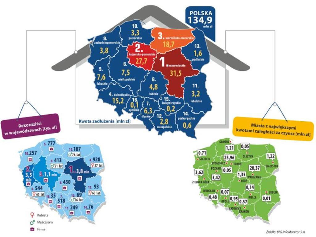 W sumie niepłacących za czynsz w bazie BIG InfoMonitor jest 10 378 podmiotów, w tym 9 707 osób. Z największymi problemami z tego tytułu zmagają się spółdzielnie, wspólnoty mieszkaniowe, a także gminni zarządcy nieruchomości w województwach: mazowieckim (31,5 mln zł), kujawsko-pomorskim (27,7 mln zł) i warmińsko-mazurskim (18,7mln zł). Najwięcej niepłacących za czynsz ma województwo kujawsko-pomorskie – 3 360 osób, następnie Mazowsze - 1 380 oraz Warmia i Mazury – 1 256.